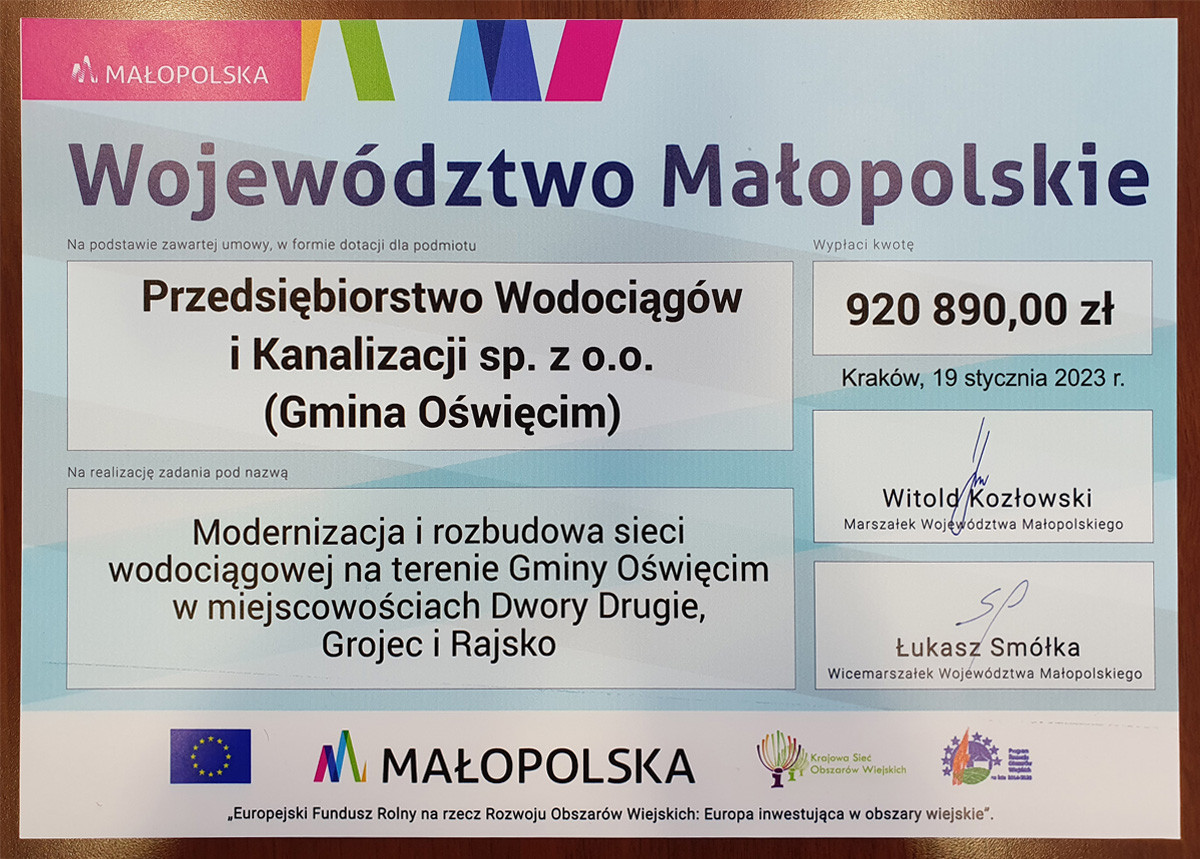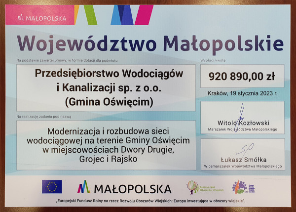 Wodociągi Oświęcim pozyskały kwotę 920.890 zł z Europejskiego Funduszu Rolnego na Rzecz Rozwoju Obszarów Wiejskich na lata 2014-2020, typ operacji "gospodarka wodno-ściekowa".
